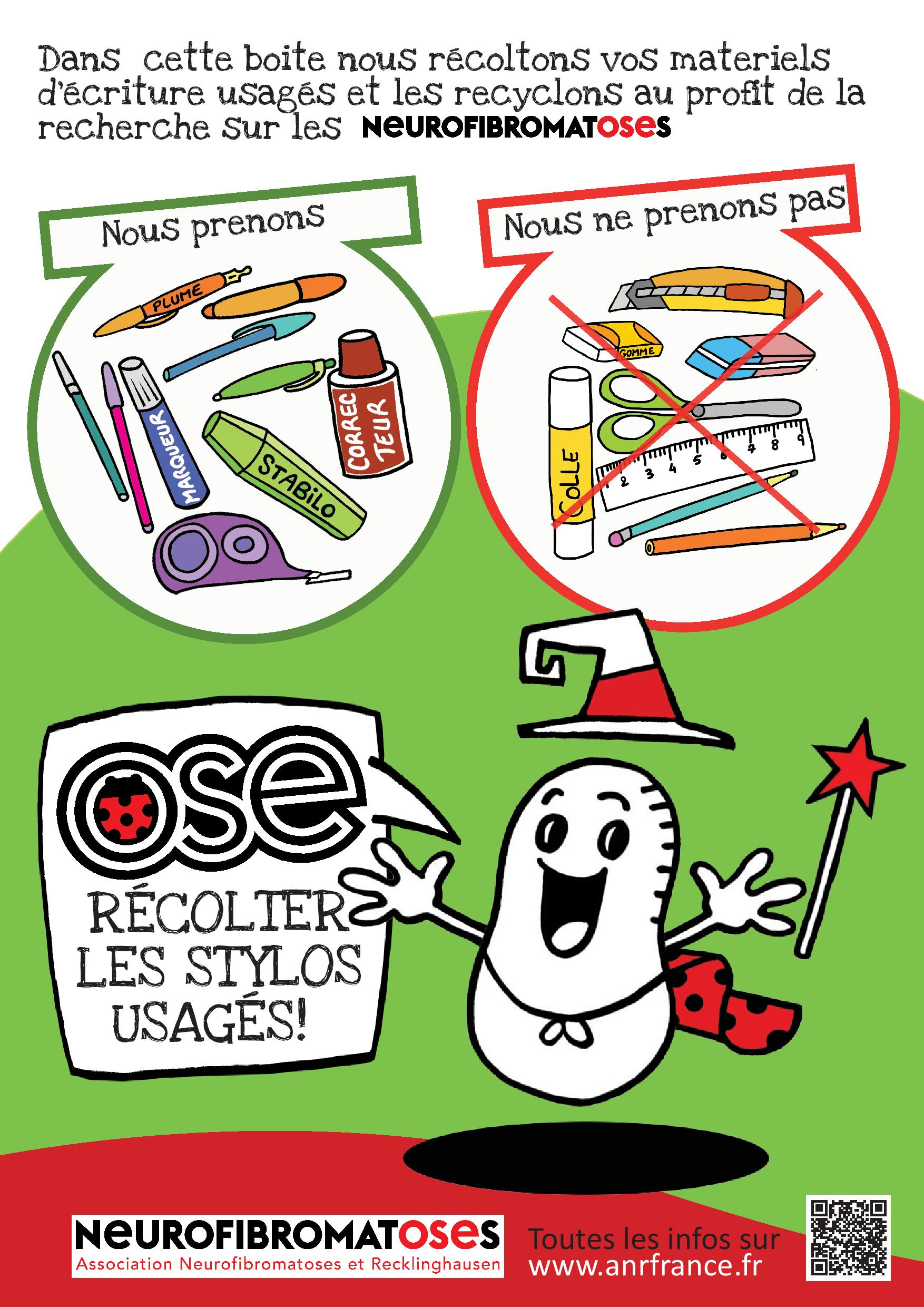 Avec ces fournitures usagées l’Association Neurofibromatoses et Recklinghausen revendra à une société de recyclage et l’argent est reversé à l’association afin de financer la recherche sur les neurofibromatoses (Maladies génétiques). Voir en PJ pour l'affiche.